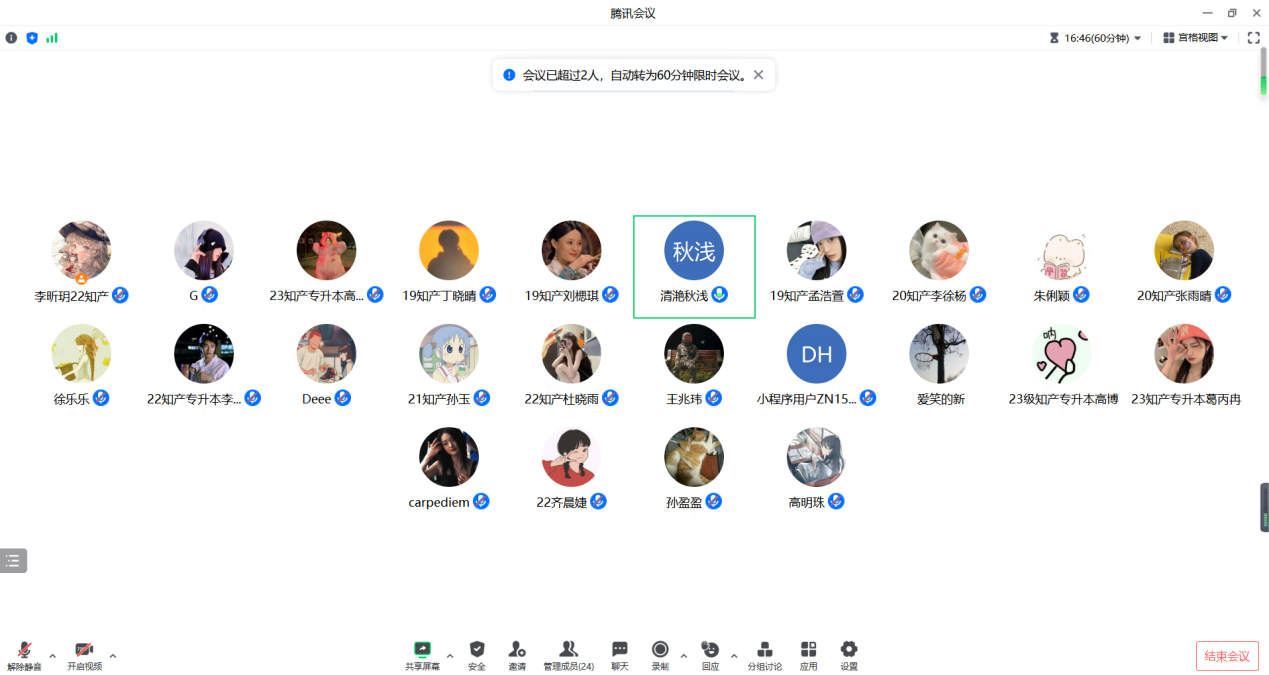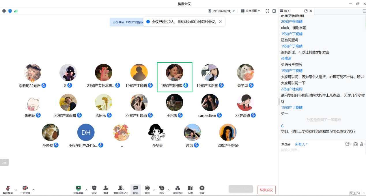 丁晓晴、刘楒琪、孟浩萱三位学姐结合自己的考研经历进行经验分享,向同学们分享了应对考研焦虑心态的方法。她们指出,考研是一个长期准备的过程,同学们要积极调整心态,合理安排时间,相信自己,拒绝内耗,向着自己的目标不断前进。学姐们对同学们提出的复习时间安排、院校选择、专硕学硕推荐、英语学习等问题给予了耐心解答,会议氛围十分热烈。