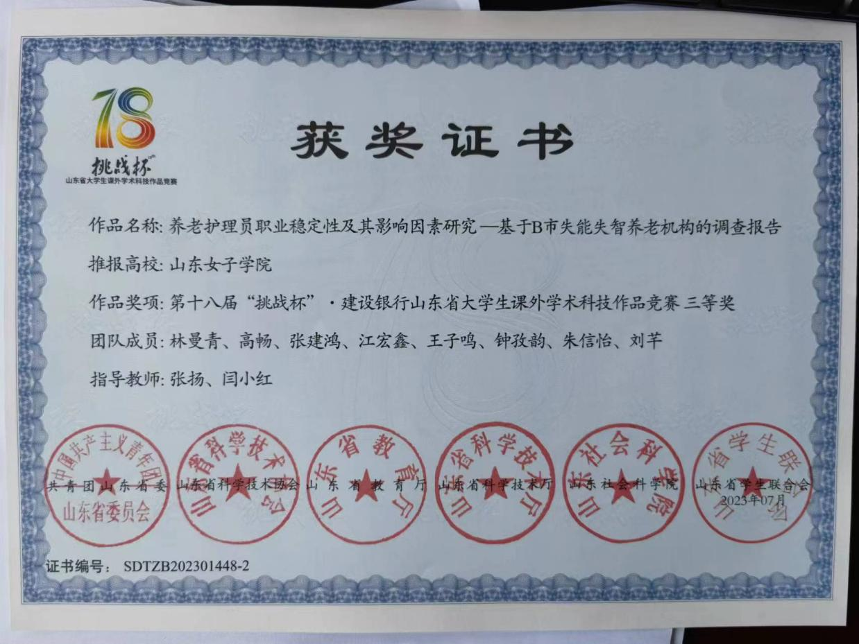 社会与法学院高度重视大学生课外学术科技活动,并作为学科建设和人才培养工作的着力点,2023年7月山东女子学院社会与法学院学生林曼青、高畅、张建鸿、江宏鑫、王子鸣、钟孜韵、朱信怡、刘芊在指导教师张扬以及闫小红的指导下,项目“养老护理员职业稳定性及其影响因素研究——基于B市失能失智养老机构的调查报告”荣获第十八届“挑战杯”,建设银行山东省大学生课外学术科技作品竞赛三等奖。
