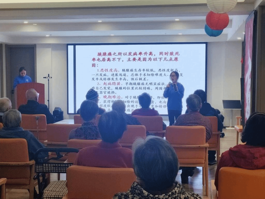 活动伊始,志愿者们借助世界胰腺癌日的余热,开展健康科普宣讲,即“万癌之王”——胰腺癌。由于胰腺癌的早期症状形式多样,不典型,很多症状与上消化道的疾病相似,所以在日常生活中比较容易被人们忽视,常常被当作胃病治疗。宣讲人为此一再强调,要注意近期出现的不能解释的腹痛、背痛、阻塞性黄疸、体重突然明显下降、血糖突然升高、消化不良、胰腺炎等问题,这些通常是胰腺癌的早期信号。针对上述病症,宣讲人也提出对应的健康指导:(1)戒烟。(2)保持合理的体重。(3)加强体育运动:坚持每周五天连续30分钟的锻炼。(4)选择健康饮食:多吃水果蔬菜,少吃谷物可以减少癌症发病风险。以此增强老年人的自我保健意识,加强对消化系统疾病的预防意识,让老人们也成为健康生活方式的参与者、践行者、受益者和传播者。