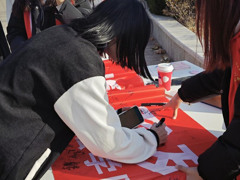 本次打卡活动在学院内设立两处打卡点,通过撕去人形立牌上一些落后的性别刻板印象的标签,并在横幅上签名的活动,向大家宣扬反对家庭暴力的思想。通过男女两个立牌的设置,向大家表明在暴力关系中,女性并非唯一受害群体的观念,从而引导同学们关注暴力关系中的弱势群体,并积极为其发声。