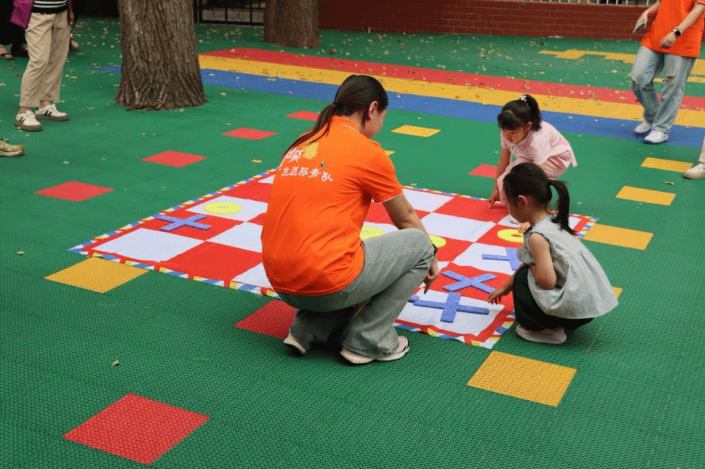 "数字九宫格"游戏结合折返跑与策略卡牌放置,分组竞赛中培养儿童逻辑思维与团队协作意识。志愿者提前画好场地、讲解规则,全程关注互动,让游戏在有序中充满活力。