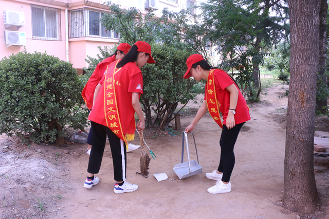 7月16日社会与法学院“向日葵”志愿服务二队开展以“绿色靠大家,环保你我他”为主题的清扫活动,志愿服务二队的14名队员走上街头,走进社区,向社区居民宣传卫生环保意识,帮助社区居民进行卫生打扫。