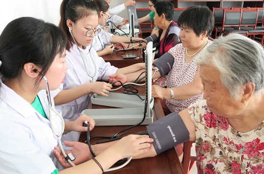 上午9点整,义诊活动正式开始。队员们利用自己专业知识,为老人测量血压以及脉搏,并提醒他们高血压的有关注意事项,耐心为老人解答疑惑。老人们积极踊跃的参与本次活动,队员们的专业能力和认真态度得到了社区内居民的一致好评。
