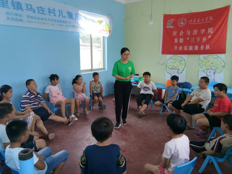 2018年7月13日,社会与法学院“向日葵”志愿服务队在济南市长清区孝里镇马庄村“童善”儿童关爱中心活动室带领农村留守儿童开展了八大智能之人际交往智能活动,加强农村留守儿童人际关系方面的发展。