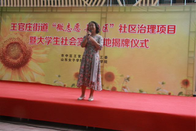 7月18日上午,由山东女子学院社会与法学院和市中区王官庄街道共同举办的“微志愿·善社区”社区治理项目暨大学生社会实践基地揭牌仪式在王官庄街道八区隆重举行。山东女子学院社会与法学院党总支书记张莹、副院长闫小红、市中区委组织部副部长刘柏、王官庄街道党工委书记朱牧、办事处主任王宏、党工委副书记冉秀玲出席本次仪式。社会与法学院专业老师及社会与法学院“向日葵”志愿服务队三队全体志愿者以及王官庄街道居民参加了此次活动。