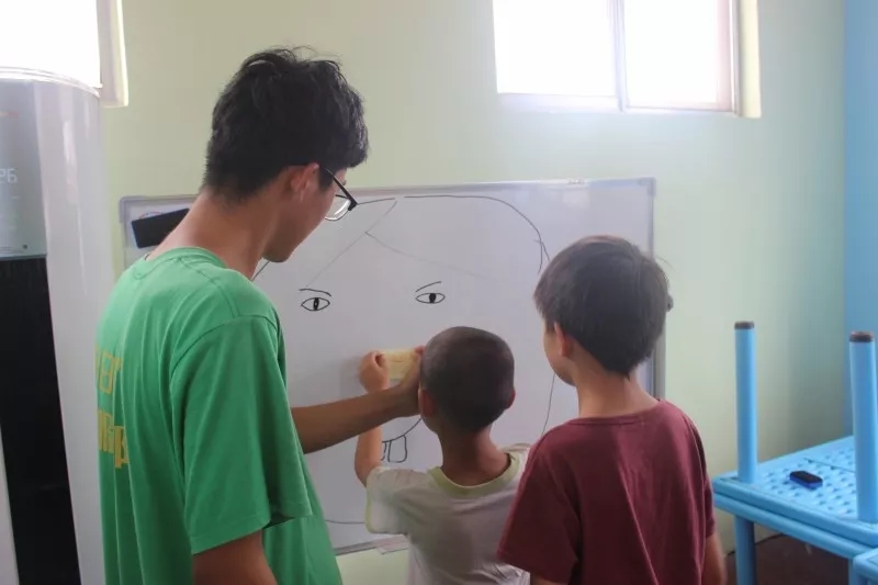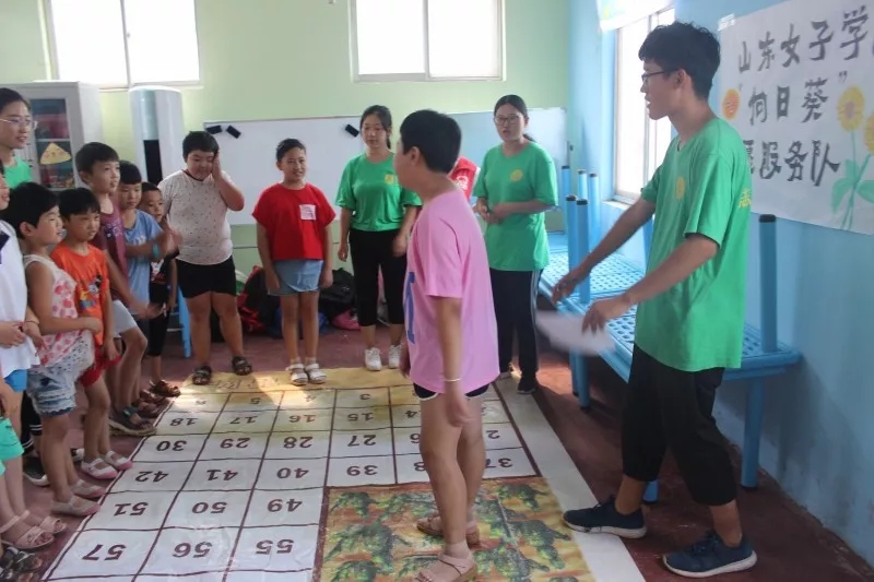 2018年7月18日,社会与法学院“向日葵”志愿服务队在济南市长清区孝里镇马庄村“童善”儿童关爱中心活动室带领农村留守儿童开展了空间智能活动,促进孩子们对空间世界的把握,提高空间转换能力。