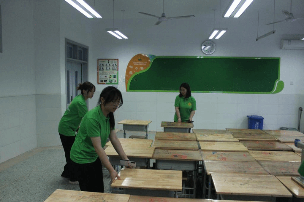 整理行李,整理教室,搬凳子、整理课桌,志愿者们已经迫不及待的想要见到我们的小朋友们了。