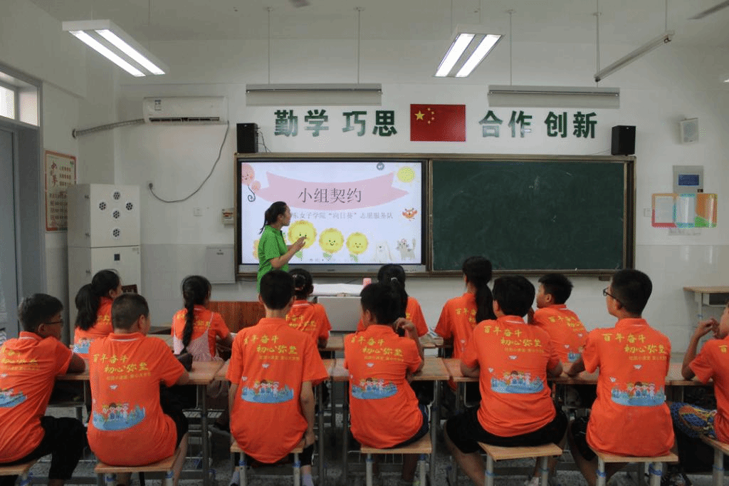成长的道路上必不可缺少的就是青春,无实践不青春,“小向日葵”要去赴约啦。面对天气的突然变化,也挡不住我们的热情,雨天有雨天的美,向日葵上的雨珠让其变得更坚定!向日葵看不到太阳也会开放,因为它从未放弃过追逐阳光。7月14日,山东女子学院“向日葵”志愿服务队来到济南市催马小学开展了第一天的志愿服务活动,此次服务对象主要是针对二至五年级的同学,开展“与爱同行,筑梦童心”——农村留守儿童“唤醒”文化教育夏令营主题活动。
