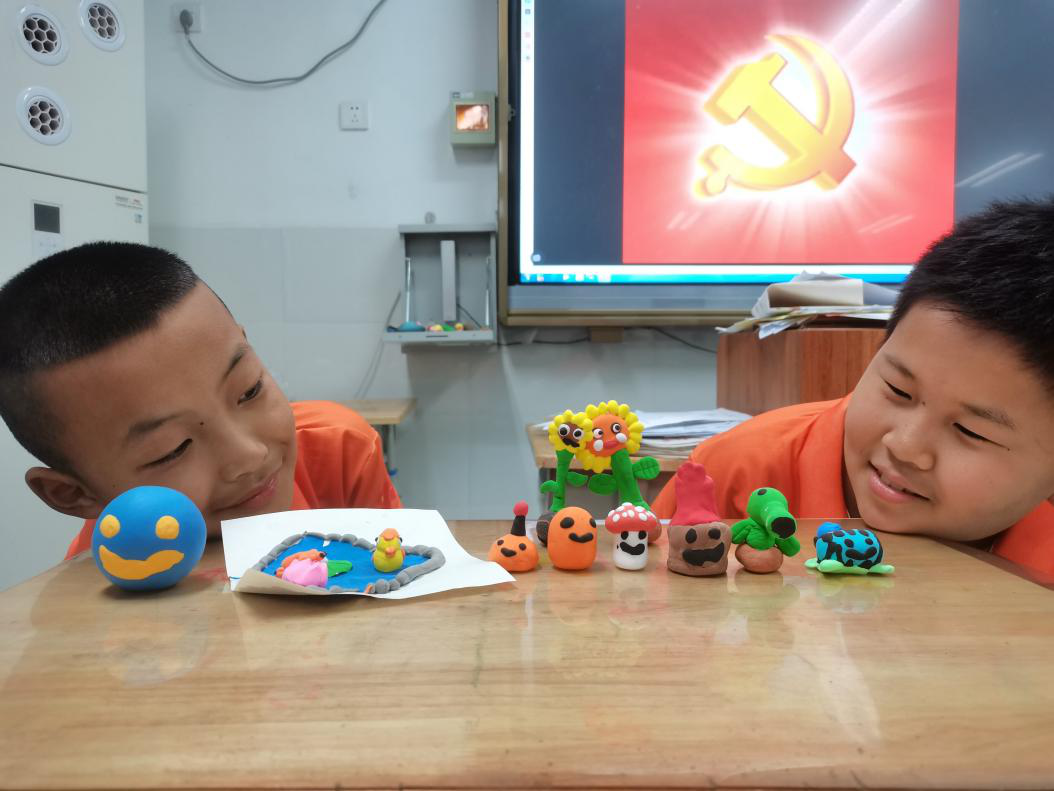 紧接着,“小向日葵们”拿出事先准备的向日葵模型,引导孩子们说出向日葵志愿服务队向阳而生的特点,并带领小朋友们一起完成自己心中的向日葵。红色系列制作过程中,在“向日葵”和小朋友的相互配合共同协作下,“童心向党”、“伟大征程”、等主题的粘土画相继完成。通过这次活动,孩子们既增长了知识,也获得了成就感,唤醒了小朋友团队合作的精神。