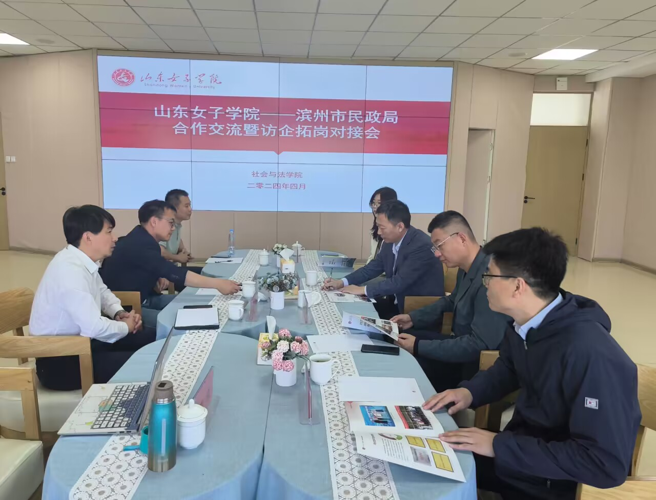 2024年4月24日,社会与法学院在求真楼608开展了山东女子学院社会与法学院与滨州市民政局合作交流暨访企拓岗对接会。滨州市民政局社会救助科科长王振东、邹平市民政局副局长靳伟、滨州市民政局社会救助科科员任晓迪、邹平市民政局社会救助科科长王凤水一行四人出席座谈会,社会与法学院副院长孙旭友、社会工作教研室主任赵记辉、社区治理与健康养老研究院院长苏海等教师参与。