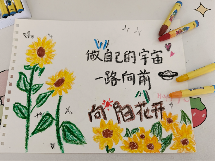 图为健康队队员为福利院儿童创作的一幅画,鼓励孩子们“做自己的宇宙,一路向前”。中国青年网通讯员 刘文营 供图