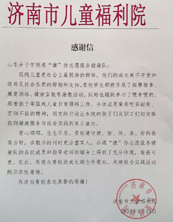 7月9日-15日,山东女子学院社会与法学院遇“健”你志愿服务健康队带着满腔的热情与深沉的关爱,踏上了三下乡的征途。活动自启动以来,志愿者们以青春之名,用实际行动诠释了爱与责任的深刻内涵,为济南市儿童福利院的孩子们送去了温暖与希望。