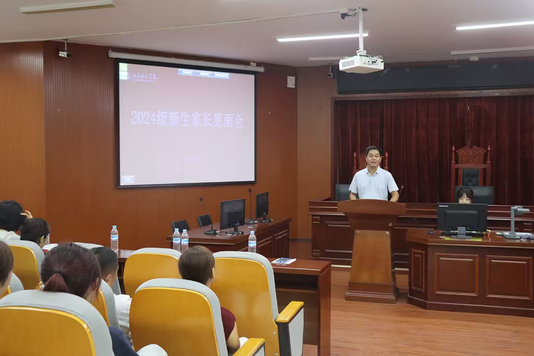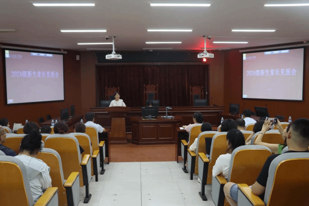 为进一步加强家校联系,增进家长对学校工作的了解,构建家校学习、交流、研讨、互动的平台,形成教育合力。社会与法学院于2024年9月3日14时在模拟法庭召开2024级新生家长会。社会与法学院杨洋书记、赵丽丽书记、吴玉霞副书记、陈涛副书记、新生辅导员张扬老师、贾心红老师以及专业负责人、新生家长出席本次会议,会议由吴玉霞副书记主持。