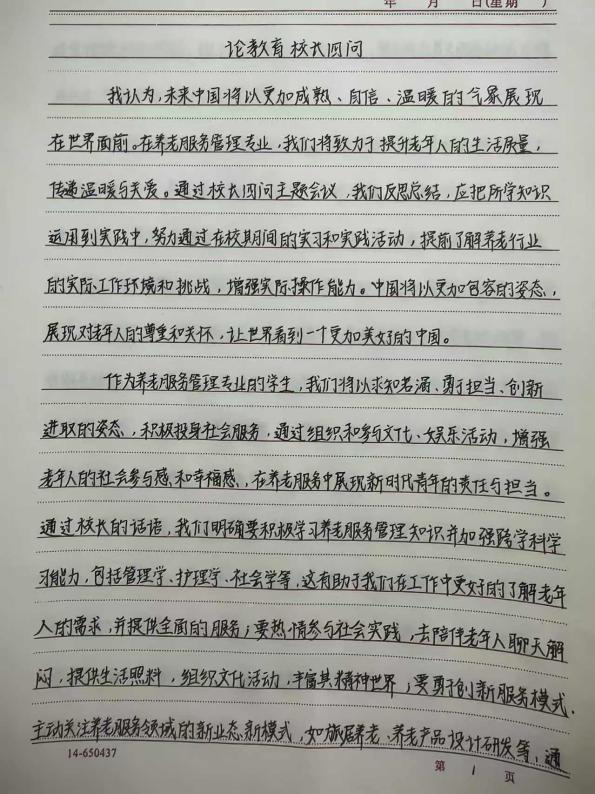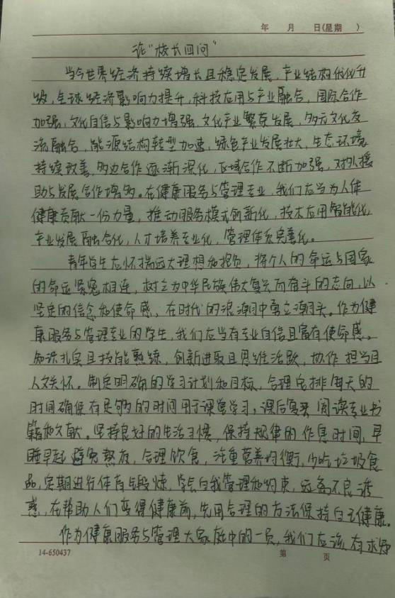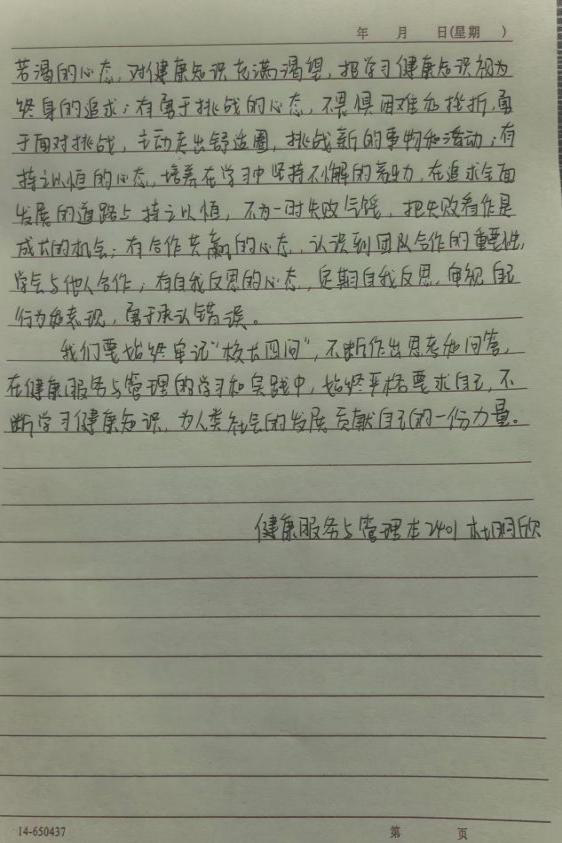 “作为健康服务与管理大家庭中的一员,我们应该有求知若渴的心态,对健康知识充满渴望,把学习健康知识视为终身的追求;有勇于挑战的心态,不畏惧困难和挫折,勇于面对挑战,主动走出舒选圈,挑战新的事物和活动;我们要始终牢记“校长四问”,不断作出思考和回答,在健康服务与管理的学习和实践中,始终严格要求自己,不断学习健康知识,为人类社会的发展贡献自己的一份力量。”健康服务与管理2401班杜明欣同学这样回答。
