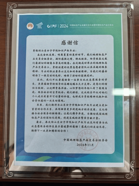 2024年10月25日至10月27日,以“地标塑品牌 贸易惠五洲——提高消费品质品味助力区域经济发展”为主题的2024年地理标志产业发展交流大会暨地理标志产品交易会成功举办,山东女子学院社会发展学院知识产权专业“法知守护”志愿者团队以卓越的服务精神、专业的职业素养以及无私的奉献精神,确保了活动的圆满成功。