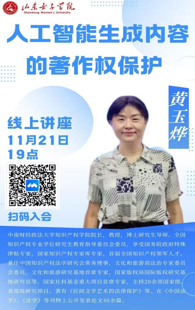 11月21日社会发展学院邀请中南财经政法大学黄玉烨教授为师生开展题为“人工智能生成内容的著作权保护 ”的学术讲座,社会发展学院师生100余人通过线上方式参加。