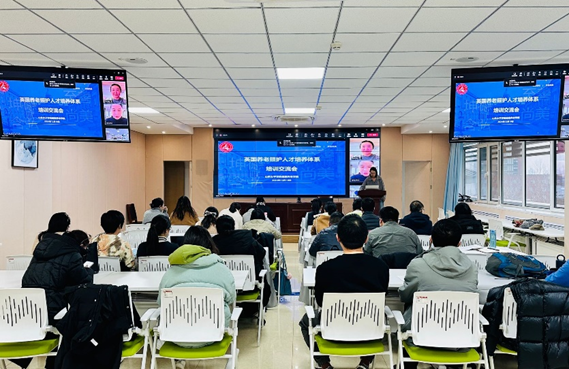 帅子英博士结合自身近30余年的临床护理实践及护理管理、教育等从业经验,宏观介绍了英国老龄化现状及英国长期照护的背景情况。强调了完善养老照护人才培养体系在提升养老服务质量方面的重要意义。对比介绍了英国长期照护人才的培养现状与问题。提出应丰富多元化养老照护人才培养模式,为养老照护人员颁发行业资格证书,推动照护人员团队逐步走向规范化、标准化、专业化,以促进全世界养老服务业高质量发展。交流环节,健康养老学院专业老师和帅子英博士针对双方感兴趣问题充分交换意见。