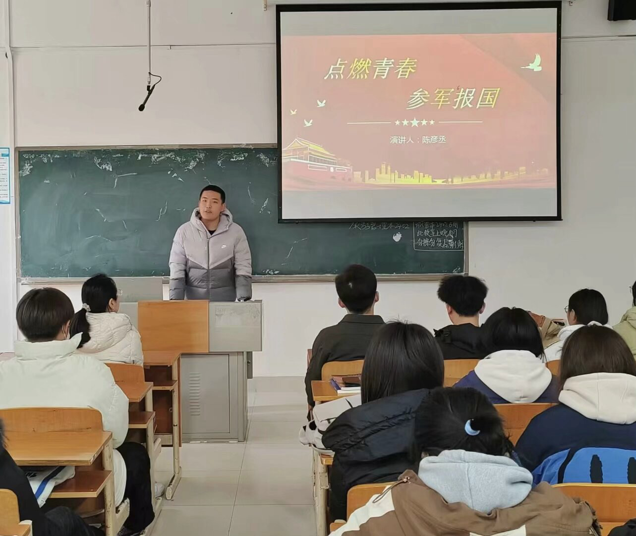 活动伊始,主持人向参会同学播放了军营生活纪录片,展示了军人的生活、训练、学习等场景,激发同学们对军营生活的向往和参军报国的热情。播映结束后,优秀退役士兵代表郭峰、陈彦丞详细解读了国家征兵政策,包括报名条件、选拔流程、福利待遇、职业发展等,帮助同学们更加全面地了解征兵政策。此外,他们讲述了自己的军旅故事,分享了军队生活对个人品格和意志的锤炼,以及军队经历对人生价值的深远影响。他们的分享让学生们对军旅生活有了更加直观和深入的了解,也进一步坚定了学生们投身国防事业的决心。