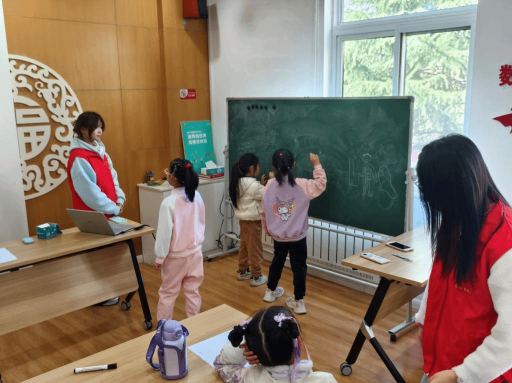 活动中,志愿者们以“击鼓传花”游戏拉开序幕,孩子们在欢快的敲击声中传递粉笔。在“职业梦想小剧场”环节,志愿者带领孩子们演绎情景剧《机器人之梦》。剧中女孩小红面对“女生做不好机器人”的质疑,与伙伴小强合作攻克技术难题,最终在科技节上大放异彩。表演中途,志愿者暂停剧情,抛出问题:“为什么小红的同学最初不相信她?”孩子们争相举手:“因为偏见!合作才能成功!”通过角色扮演与互动讨论,孩子们深刻体会到职业选择应基于热爱与能力,而非性别束缚。