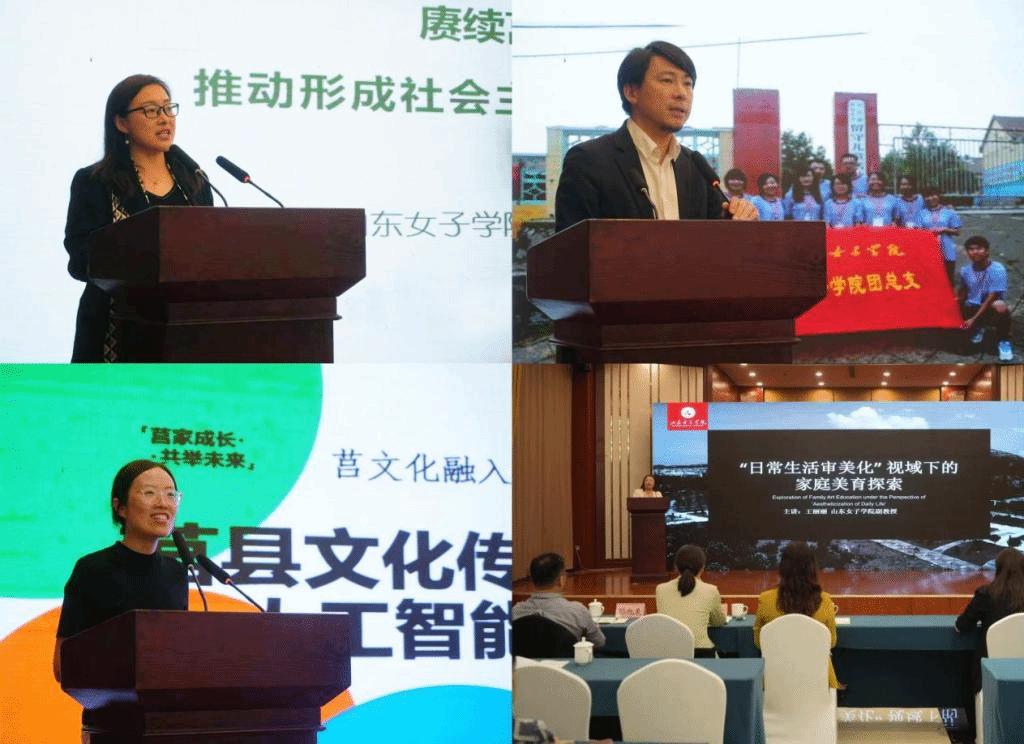 山东女子学院妇女研究与发展中心主任王慧以《赓续莒县文化基因,推动形成社会主义家庭文明新风尚》为主题,强调从莒文化中汲取家庭伦理智慧,为社会主义家庭文明新风尚注入地域文化特色。社会发展学院教授赵记辉地方文化融入家庭教育策略基于全国及山东家庭教育服务体系试点经验,提出了结合传统文化的理念创新、机制创新、平台融合、队伍内化、服务创新的五大策略。艺术学院副教授王丽丽则从 “日常生活审美化” 视角出发,探讨家庭美育与莒文化传统艺术元素的融合路径,提出通过生活场景中的美学教育提升家庭文化素养。社会发展学院副教授董小菲则聚焦《莒县文化传承与家庭教育创新:人工智能赋能的媒介抚养新路径》,探讨如何利用智能技术创新亲子互动模式,推动莒文化在数字时代的创造性转化。莒县县教体局党组成员张春禄分享了《构建协同育人共同体 激活家庭教育新动能》的实践经验,展示了当地家校社协同育人的成果;县妇联党组书记刘长军则以《莒县家庭生态建设的探索与实践》为题,介绍了县域内家庭文明建设的特色模式。