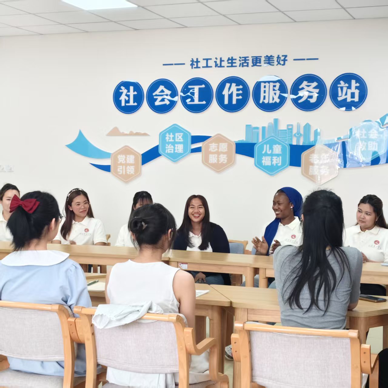 学生聚焦来华留学生的学习与社会适应展开交流。首先留学生分别做了简单的自我介绍,各分享了在学校的学习和生活感受。随后社会工作的学生为留学生介绍了所学专业、社团活动和学校生活。交流环节留学生分享了在女院的生活学习,并向大家介绍自己国家的独特文化和本国社会工作专业的发展情况,现场气氛轻松活跃。此次交流会为双方学生搭建了沟通桥梁,促进文化交流与融合,拓展了社会工作专业学生的国际视野,助力留学生更好适应学习生活。