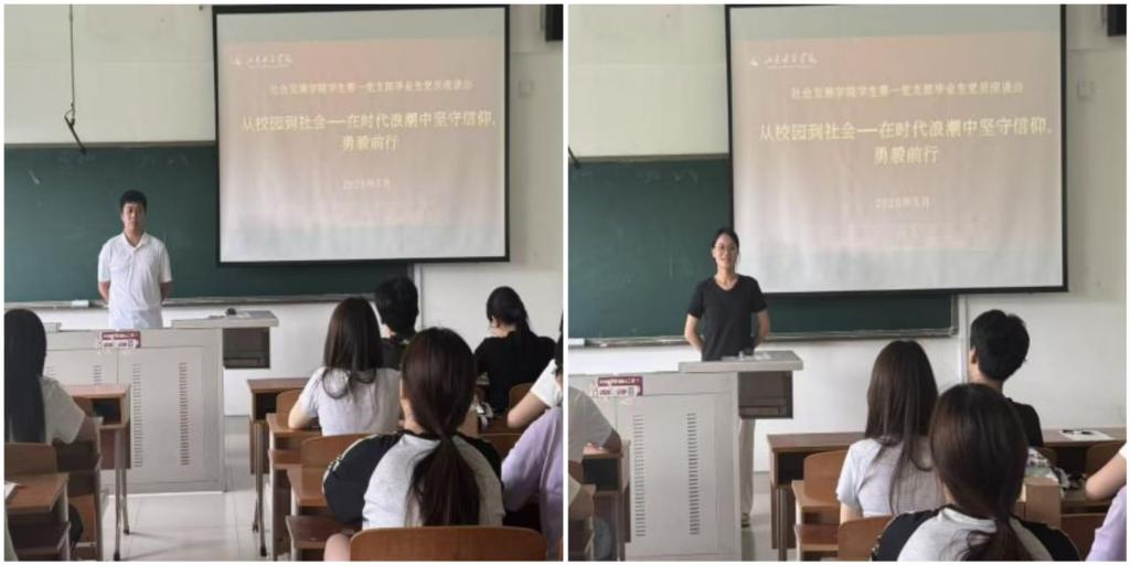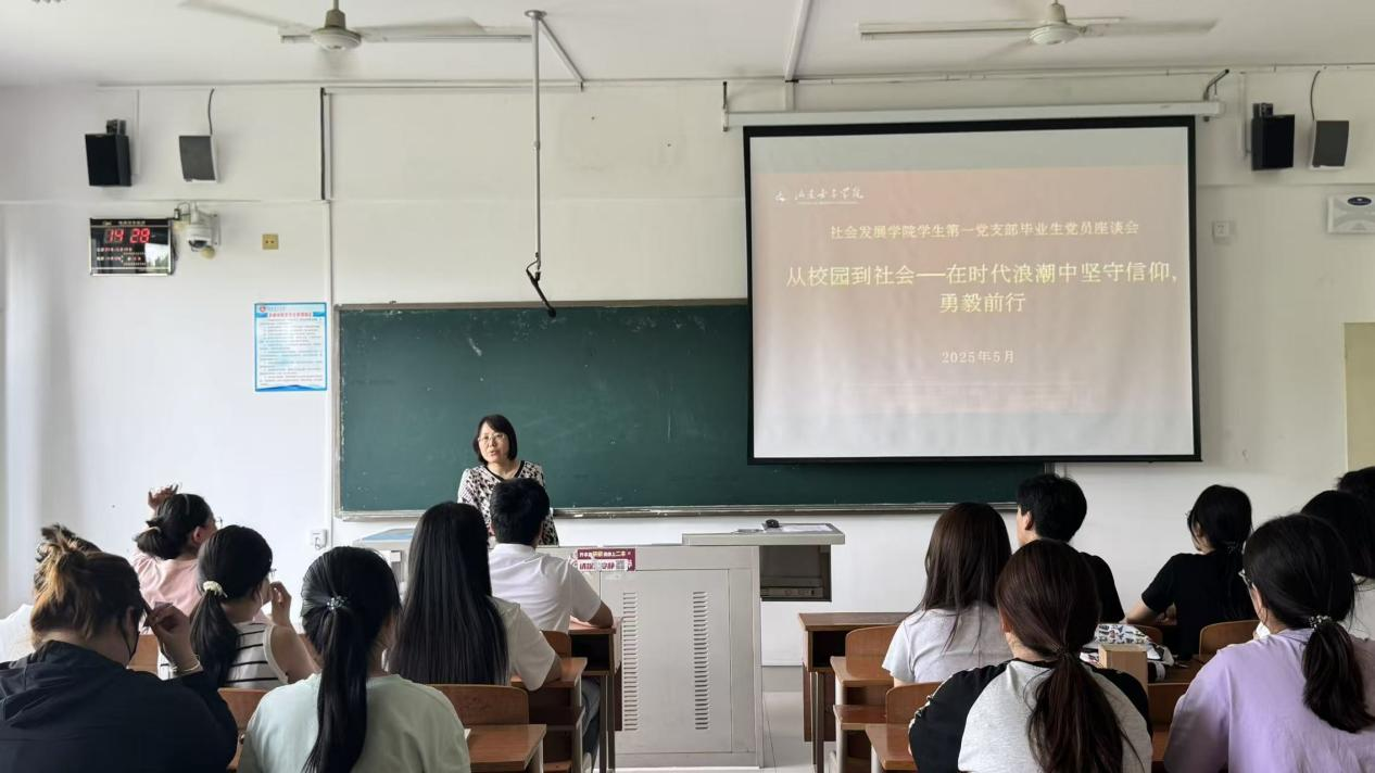 5月15日,社会发展学院召开以“从校园到社会——在时代浪潮中坚守信仰,勇毅前行”为主题的毕业生党员座谈会,旨在引导毕业生党员坚定理想信念,强化作风建设,在步入社会后持续发挥先锋模范作用。社会发展学院党委副书记吴玉霞和全体毕业生党员参加会议。