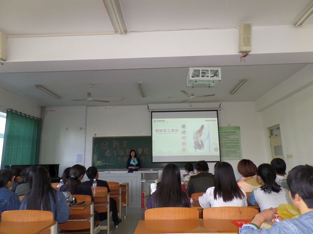 教研室主任和校企合作企业——山东幸福世家老龄产业投资股份有限公司的工作人员分别进行了宣讲。教研室主任金莉首先从社会需要、国家和政府支持、我校办学优势等方面分析了我校开办老年服务与管理专业的原因,之后介绍了该专业的培养目标、专业定位、就业前景、师资力量、课程设置等情况。
