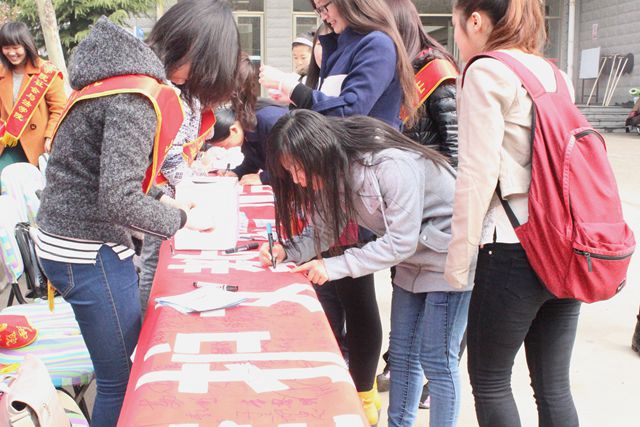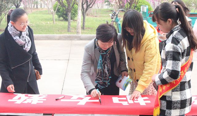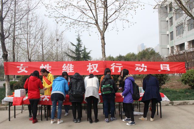 在学校党委书记郭翠芬的带领下,师生纷纷在条幅上签名,支持“维护女教职工合法权益”宣传活动。学生志愿者向师生发放“女教职工维权”宣传册,积极进行女性维权的普法宣传。同时设立法制咨询台,就“如何避免合法权益受到侵害”、“如何正确维权”等问题接受法律咨询并做出详细解答。