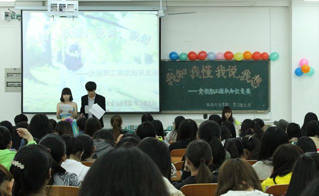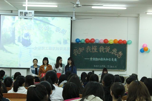 4月16日下午,社会与法学院在合班楼210举办“我知、我懂、我说、我想”女教职工维权知识竞赛,社法学院各班学生参加本次活动。