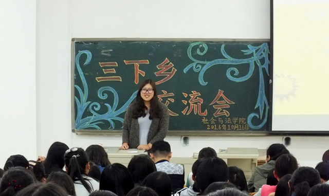 10月16日晚,社会与法学院在博文楼208举办暑期“三下乡”社会实践分享交流会。社会与法学院“向日葵”志愿服务队的队员及全体2016级新生参加了此次活动。