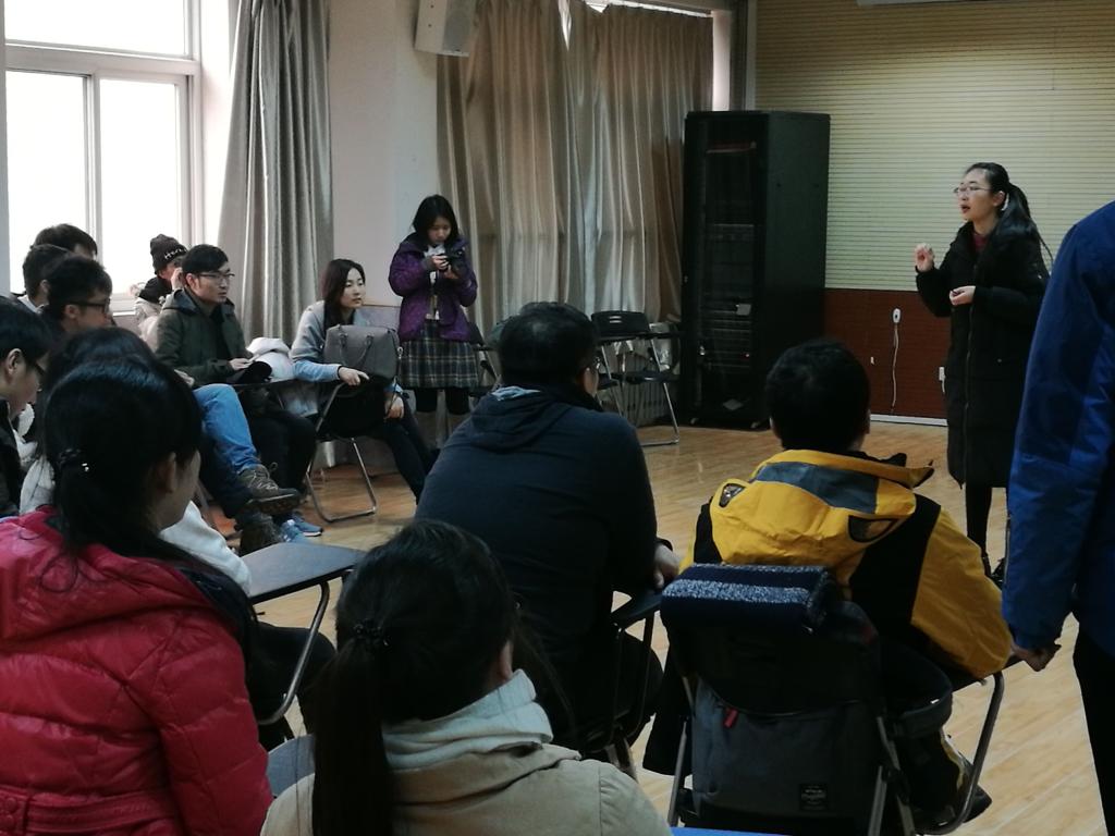此次香港中文大学社会工作学系山东考察交流团的成员都是来自社会工作相关专业的研究生、博士生和博士后,我校社会工作专业2014级本科生向考察团成员介绍了我院社会工作专业当前的发展情况。即使室外风雪交加,但是考察团成员所到之处总是洋溢着欢声笑语,在我院社会工作专业同学的带领下,考察团成员依次参观了社会工作专业综合实训室、个案工作实验室、家庭社会工作实验室、儿童青少年艺术治疗实训室、沙盘工作实训室、小组工作实训室等实验室。考察团成员对于我院社会工作专业配备基础设施的表示了极大的肯定,并且惊讶的表示:“你们的专业程度超过了我们的想象,这些实验设备能够真正的向外开放,并让大家锻炼专业技能真的很棒。”