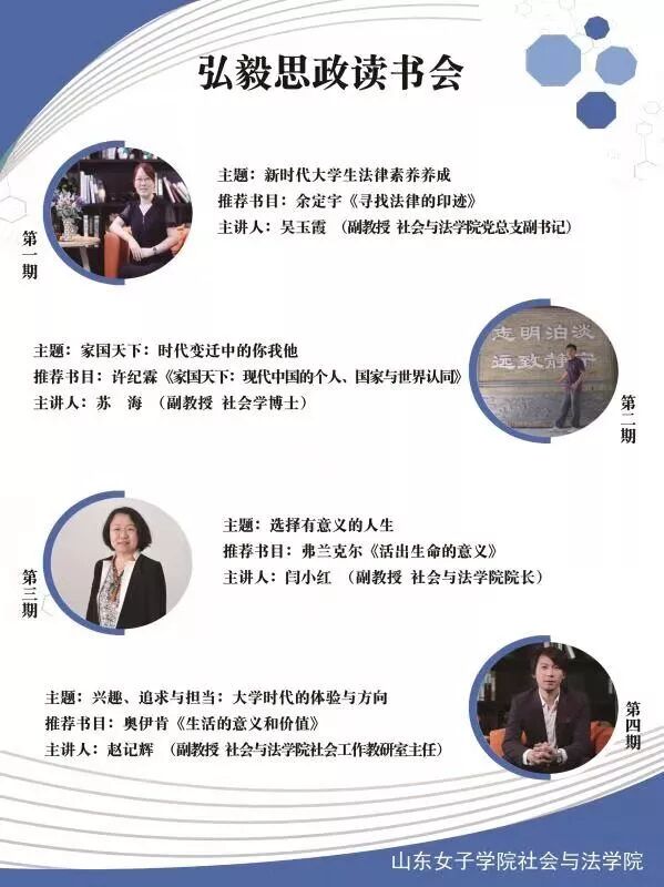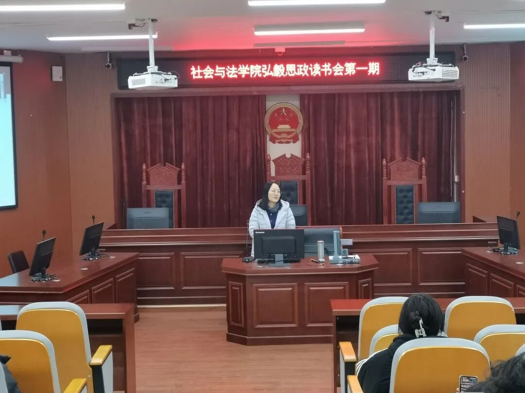 为落实学院12446育人体系,推进第一、二课堂深度融合,本学期组织弘毅思政读书会,以提升学生综合素养。2020年12月28日至30日,社会与法学院开展了四期弘毅思政读书会,分别由闫小红、吴玉霞、苏海、赵记辉四位老师主讲,各专业学生踊跃报名,共有400多名学生参加了读书会。
