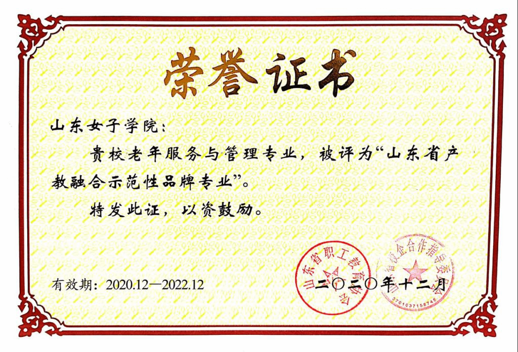 根据鲁职教协字〔2020〕11号“关于组织推荐山东省产教融合示范单位(基地)、示范性品牌专业、职工与职业教育领军人物、创新创业先锋和专业(学科)骨干带头人的通知”文件要求,学院积极申报,经学校推选和评审会专家评议, “老年服务与管理”被评为“山东省产教融合示范性品牌专业”。