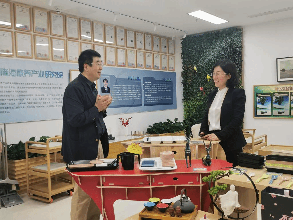 融创隆海健康管理有限公司副总经理、融创隆海产业研究院首席院长杨德苑、副院长谷学军热情接待了刘恩允一行。杨德苑院长陪同刘恩允一行参观了藏马山颐养社区,全面介绍了项目运营情况以及“游戏化思维”、“生活美学”、“随公益”等先进养老理念,随后双方围绕产业学院重点推进的工作进行了深入探讨。
