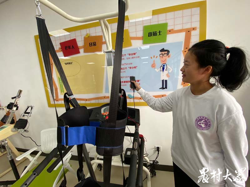 养老服务管理的学生演示辅助下肢步行训练机使用。