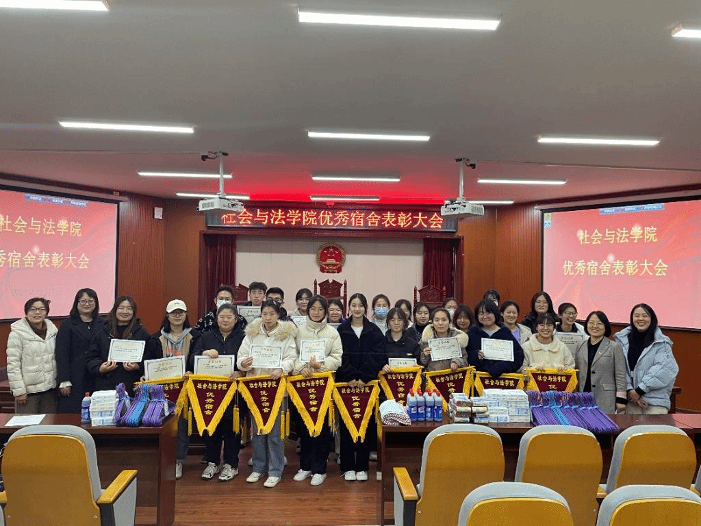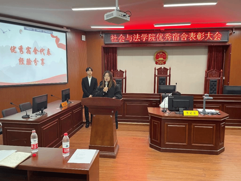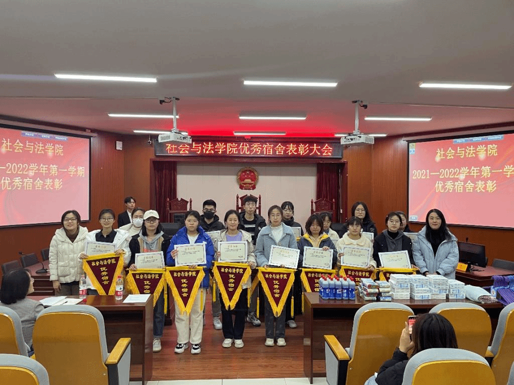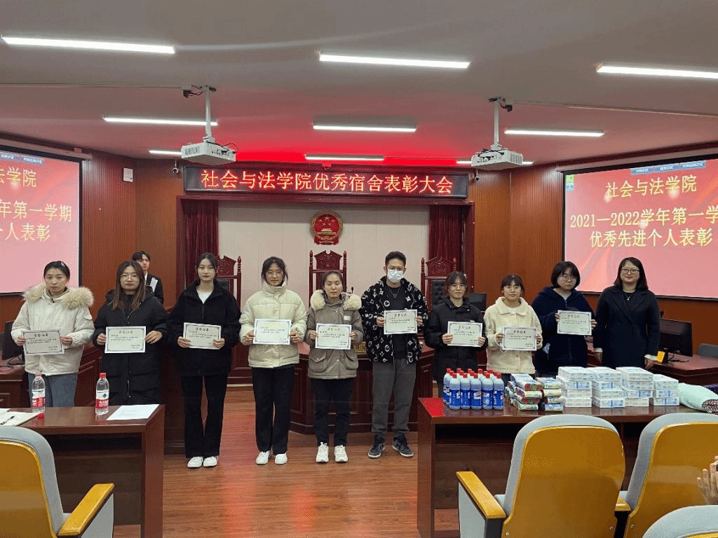 为增强学生对文明宿舍建设的积极性,进一步落实宿舍管理工作,2021年12月9日下午,社会与法学院在博文楼模拟法庭110教室举办了2021-2022学年第一学期优秀宿舍表彰大会。本次表彰大会由学院自律会主办,学院党委副书记吴玉霞、学生公寓管理中心主任李绍妮、社会与法学院团总支书记张扬、社会与法学院辅导员王晴晴参加此次表彰大会。
