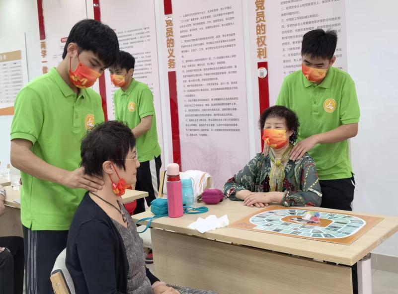在活动开始之前,老师们首先带领参加此次活动的成员们进行暖场手指操活动,激发老人们的手指灵活度,旨在用手指的运动带动全身的热身活动,从而达到带动整体氛围的作用。随后,志愿者们分成几组开始老年游戏会,为老人们介绍玩具玩法,采用即时比赛或者双人对弈,并且为游戏获胜的老人们准备了抽奖福利。为宣传中医健康理论,让老人们能够更好的体验健康理疗服务。学生们利用耳朵按摩豆以及按摩推拿等方式,帮助老人们放松身体,同时达到调理脏腑、疏通经络、缓解疲劳等按摩推拿的各种功效。老人们对志愿者们的按摩推拿服务表示非常满意,在接下来的合唱红歌环节中,老人们慷慨激昂,情绪高涨,散发出浓厚的爱国情怀。在活动的最后,为充分体现出此次“桑榆晚晴 养乐同行”志愿服务活动的主题所在,学生们细心去发现并询问老人们心中的烦恼,为他们排忧解难,放松心情。