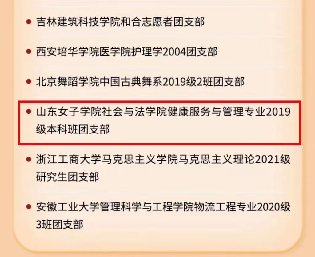 经过校内选树、校级展示、省级展示、全国展示等环节,山东女子学院社会与法学院健康服务与管理专业2019级本科班团支部荣获2022年度全国高校最具贡献度“活力团支部”。
