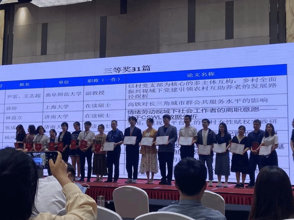 闫小红院长、孙旭友副院长、赵记辉副教授分别担任分论坛二、分论坛三、分论坛四的点评人。孙旭友副教授的论文《社会治理视域下养老诈骗风险的生成逻辑与化解路径》、赵记辉副教授的论文《残疾儿童家庭康复支持的社会工作干预研究:基于脆弱性的视角》、李宏芳博士的论文《循环与差异:县域城乡融合的空间演进及发展逻辑》、刘静博士的论文《合作社供给农村养老服务的模式与运行机制》分别获得优秀论文三等奖。