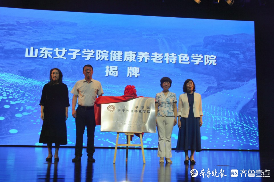 吕晓黎、张志毅、张凤莲和金龄健康产业投资(山东)有限公司副董事长包托娅共同为山东女子学院健康养老特色学院揭牌。