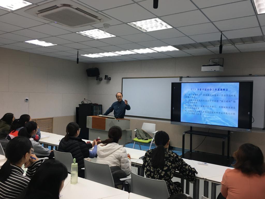 18日下午,史柏年教授以宏观视角介绍了中国社会工作发展的路径、现状及未来,提出了社会工作专业学习应具备历史观和发展观;程胜利教授聚焦社会工作专业方法的应用,系统对萨提亚家庭治疗与接纳承诺疗法进行了比较分析。20日上午,马凤芝教授则从健康中国背景讲起,分享了健康社会决定因素视角下的健康社会工作的发展。