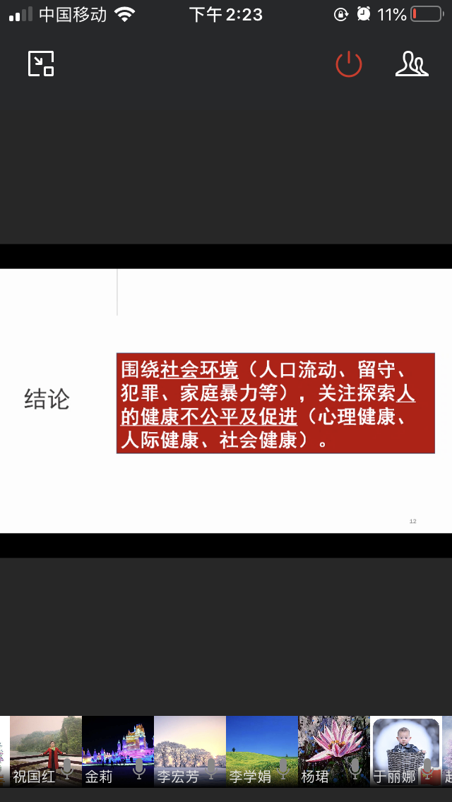 学科各方向负责人和骨干教师围绕研究主题进行了热烈的讨论。苏海博士提出跨学科的研究是未来研究方向,建议从实践的角度,尽快确定可落地的社区进行实践研究,从简单的主题切入进行研究。林存秀博士从生态女性主义的领域出发,建议团队成员对前期研究方向与当前主题进行结合。金莉副教授提出从大健康的概念出发,对研究地域进行选择。赵记辉副教授从社会环境与健康的难点,核心观点、社会科学的研究、医学的关注、大健康与健康教育学院、新文科建设等层面进行分析,进而提出了依托社区的健康管理(母婴健康老年人健康残疾人健康),通过教学-科研-社会服务相结合,调研和干预相结合的方式,围绕社会环境(人口流动、留守、犯罪、家庭暴力)关注探索人的健康不公平及健康促进(心理健康、人际健康、社会健康)。王文静博士从人文性的健康概念出发,提出关注社会福祉,关注社会矛盾,回应社会需求。其他教师分别从研究方法、研究方向及研究切入点等层面进行讨论和发言。