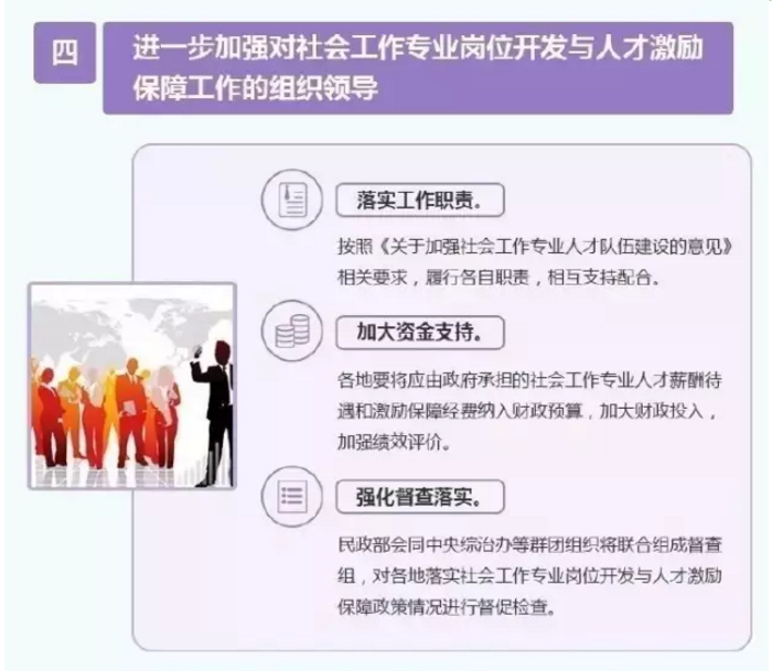 (三)强化督查落实。民政部会同中央综治办、教育部、公安部、司法部、财政部、人力资源社会保障部、国家卫生计生委等部门以及全国总工会、共青团中央、全国妇联、中国残联等群团组织将联合组成督查组,对各地落实社会工作专业岗位开发与人才激励保障政策情况进行督促检查,研究解决政策实施中的突出问题。各地相关部门要对本地区贯彻落实社会工作专业岗位开发与人才激励保障政策的情况进行督查,确保各项政策要求落实到位,确保社会工作专业人才有广阔的职业发展空间,其薪酬待遇水平与职业地位得到明显提高。
