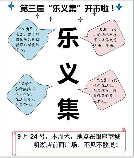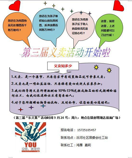 下午,我们两位实习生去社区贴我们周六“乐义集”活动的宣传单页,能够进去的小区就将宣传单页贴在比较明显的地方,遇到不让进入的小区,我们就将宣传单页交给小区的保安叔叔,并简单的向他们介绍了一下我们的活动,首先让他们对我们的活动产生兴趣,然后再让保安叔叔帮忙宣传,让更多的人知道我们的活动,他们也很支持我们,连连说好。