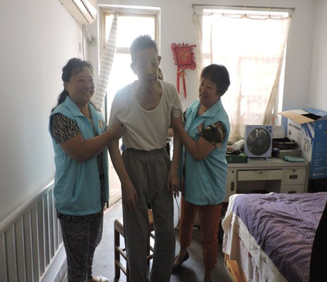 (图为“爱心义剪”义工队的阿姨扶起完成理发的爷爷)