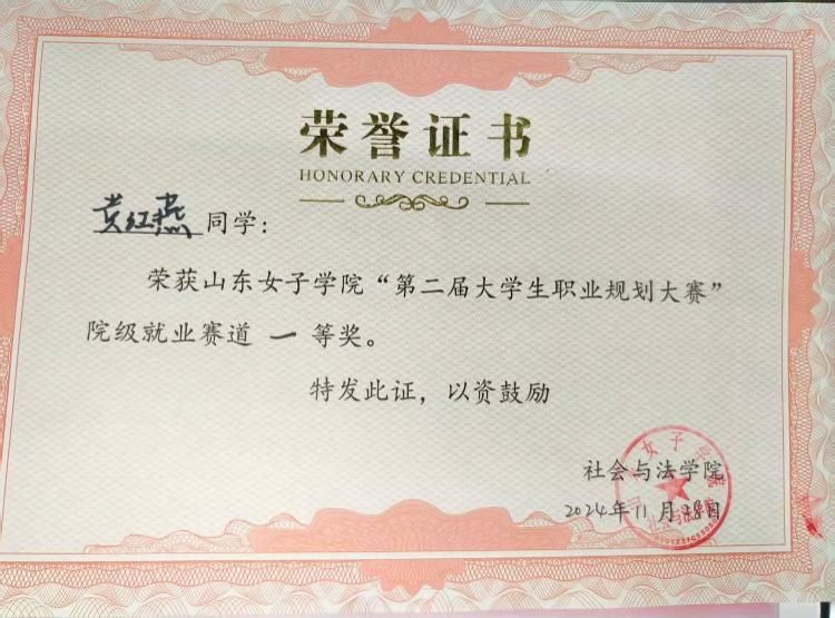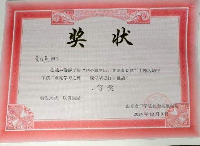 在校园生活中,她注重全方位提升自身素养,积极参与各类校园文化活动。获得“同心筑学风,共绘青春梦”课堂笔记打卡挑战一等奖;在山东女子学院“第二届大学生职业规划大赛”中,她梳理自身优势与发展方向,荣获院级就业赛道一等奖,在探索中明确成长路径,为未来发展积累经验。此外,她始终以高标准要求自己,凭借良好的思想觉悟和行为表现,获评“优秀共青团员”荣誉称号,在日常历练中涵养责任与担当。